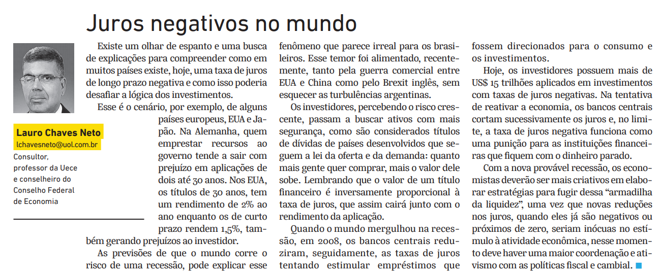 JUROS NEGATIVOS NO MUNDO – Artigo de opinião do Conselheiro Federal Lauro Chaves Neto