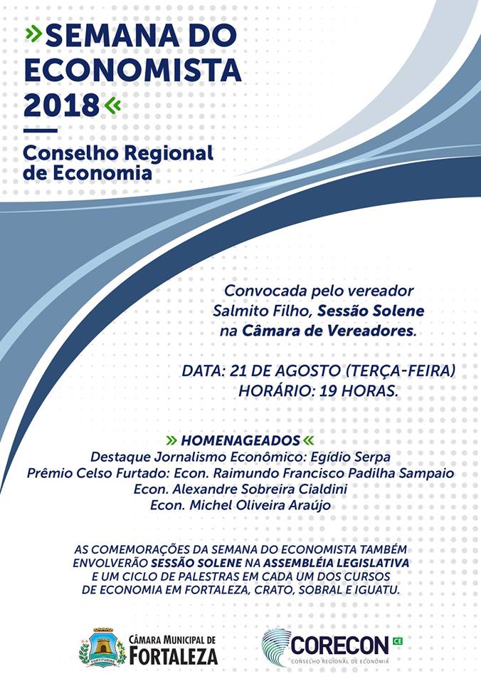 Participe das comemorações referentes ao Dia do Economista. Sessão Solene na Assembléia Legislativa DATA: 16/08/2018 Horário: 19H
