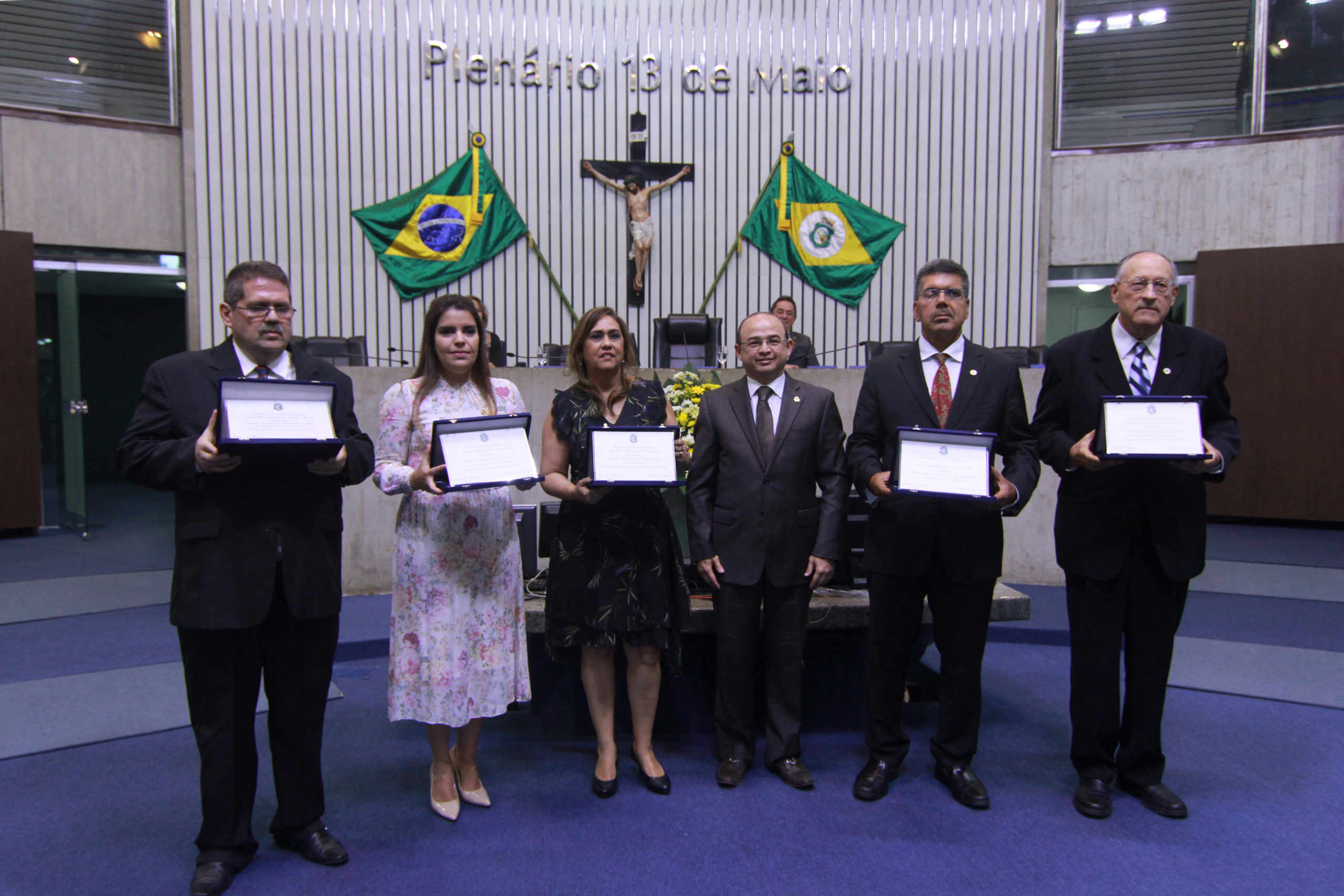 Economista Demartone Coelho, Candice Graziani (Unifor), jornalista Regina Carvalho, deputado Sérgio Aguiar, Lauro Chaves (Corecon) e economista Edilson Sarriune O…