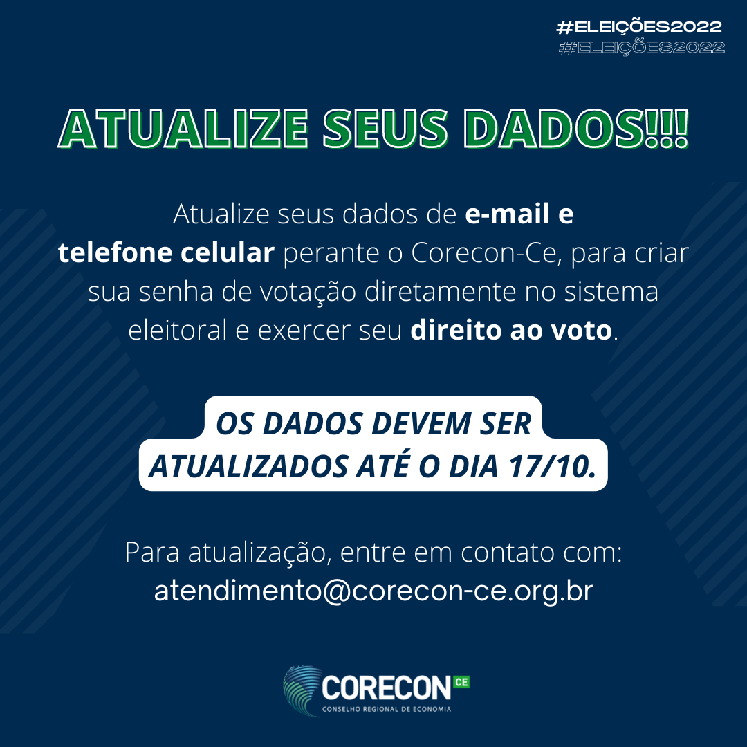 Atualize seus dados de e-mail e telefone celular perante o Corecon-Ce, para criar sua senha de votação diretamente no sistema…