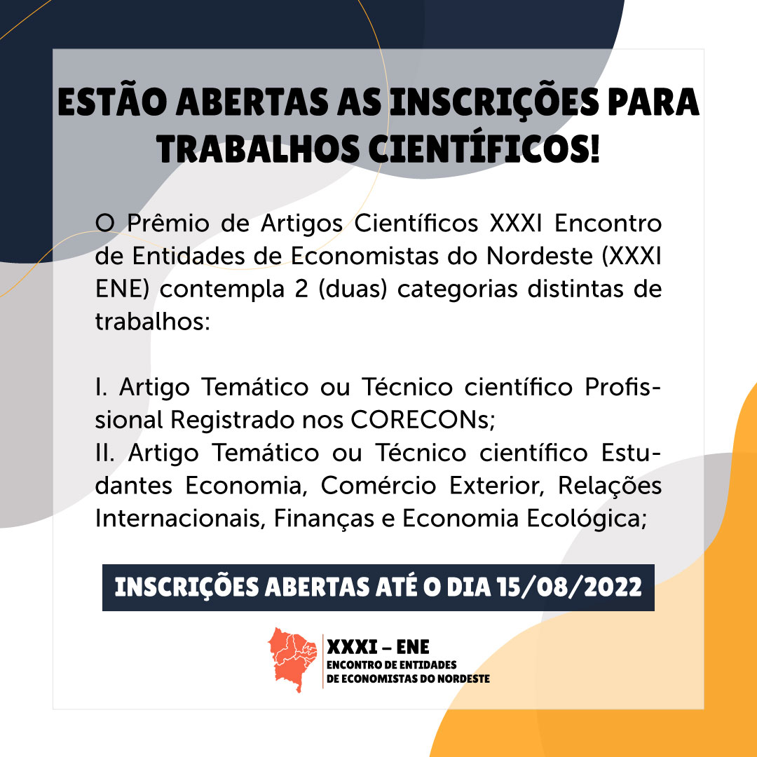 O Prêmio de Artigos Científicos XXXI Encontro de Entidades de Economistas do Nordeste (XXXI ENE) contempla2 (duas) categorias distintas de…