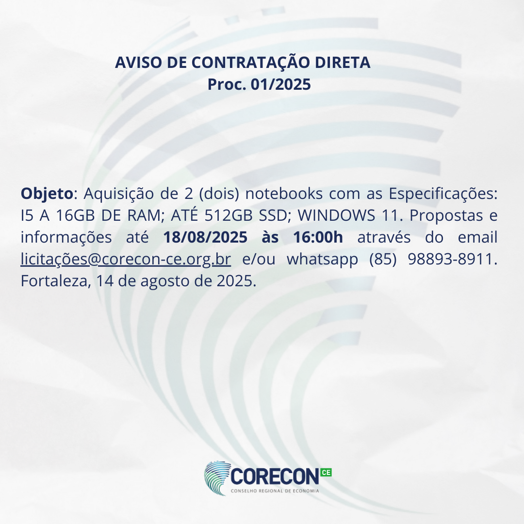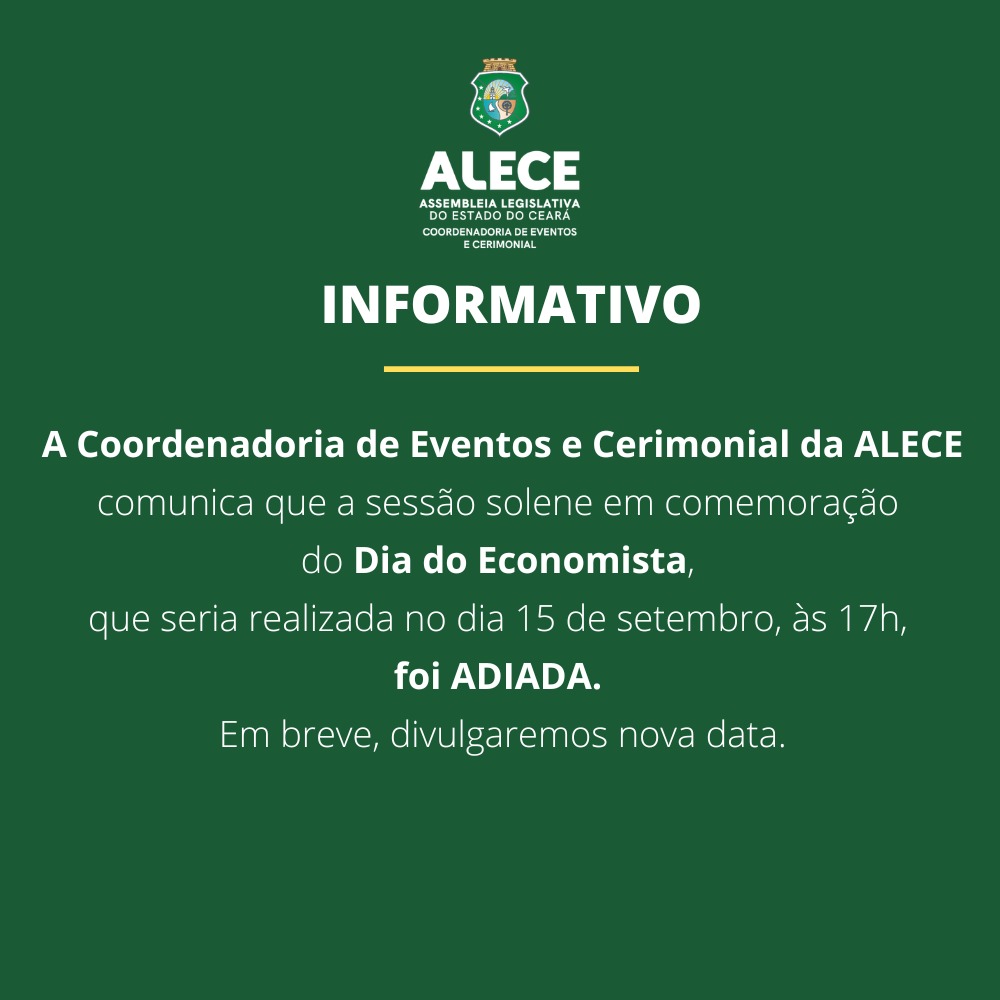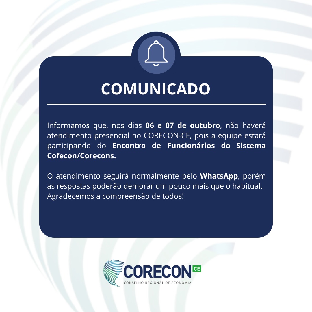 O CORECON-CE informa que a sessão solene em comemoração ao Dia do Economista, que estava prevista para o dia 15…