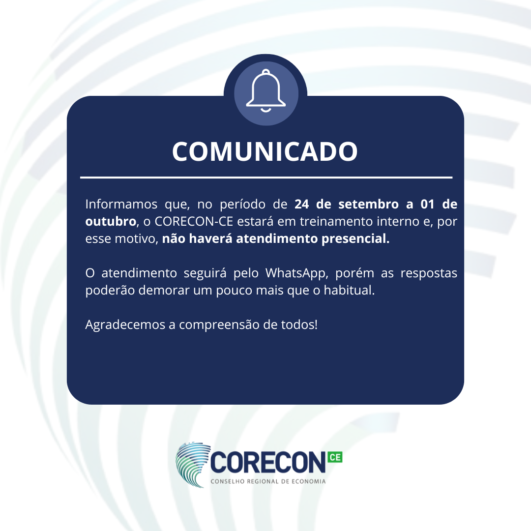 Informamos que, no período de 24 de setembro a 01 de outubro, o CORECON-CE estará em treinamento interno e, por…