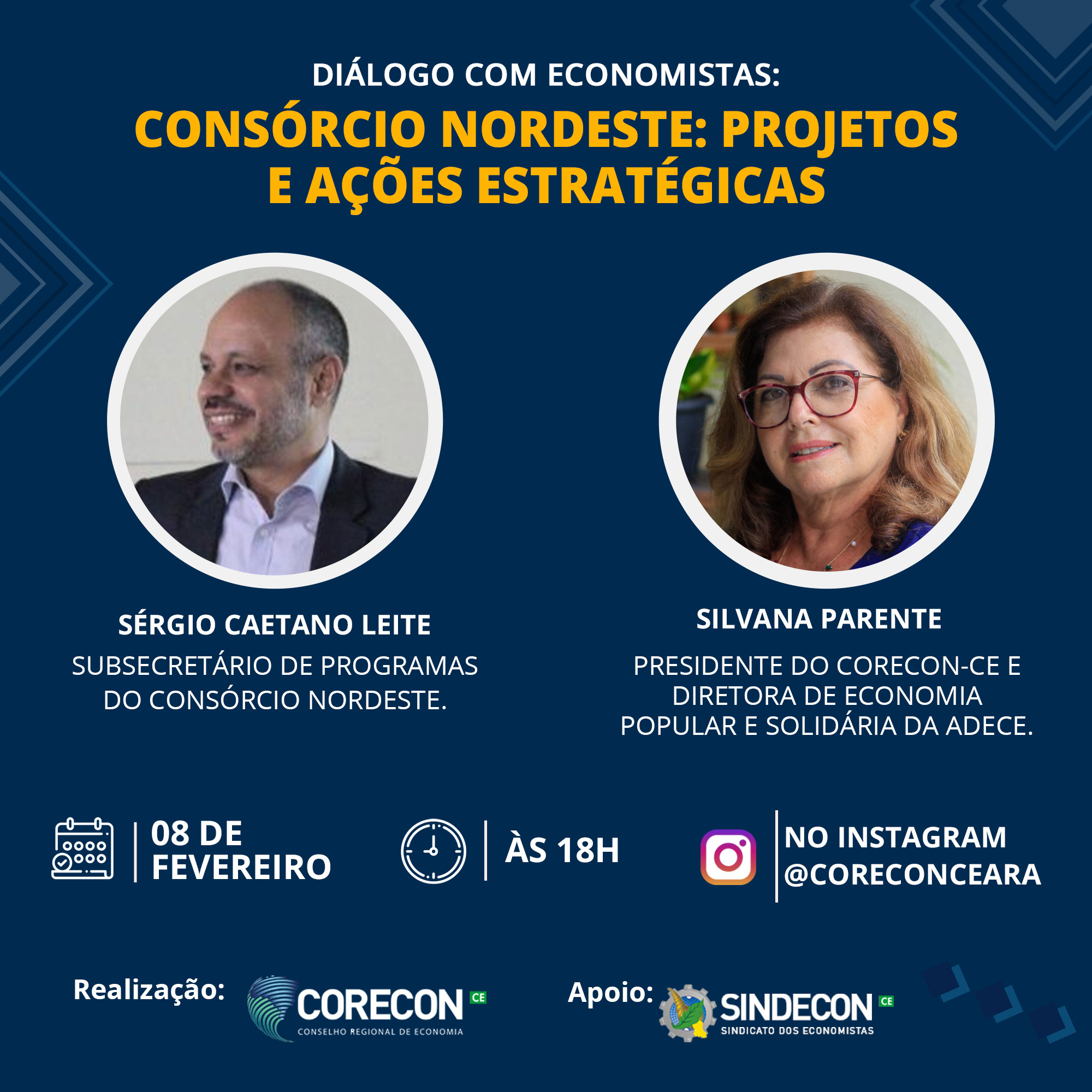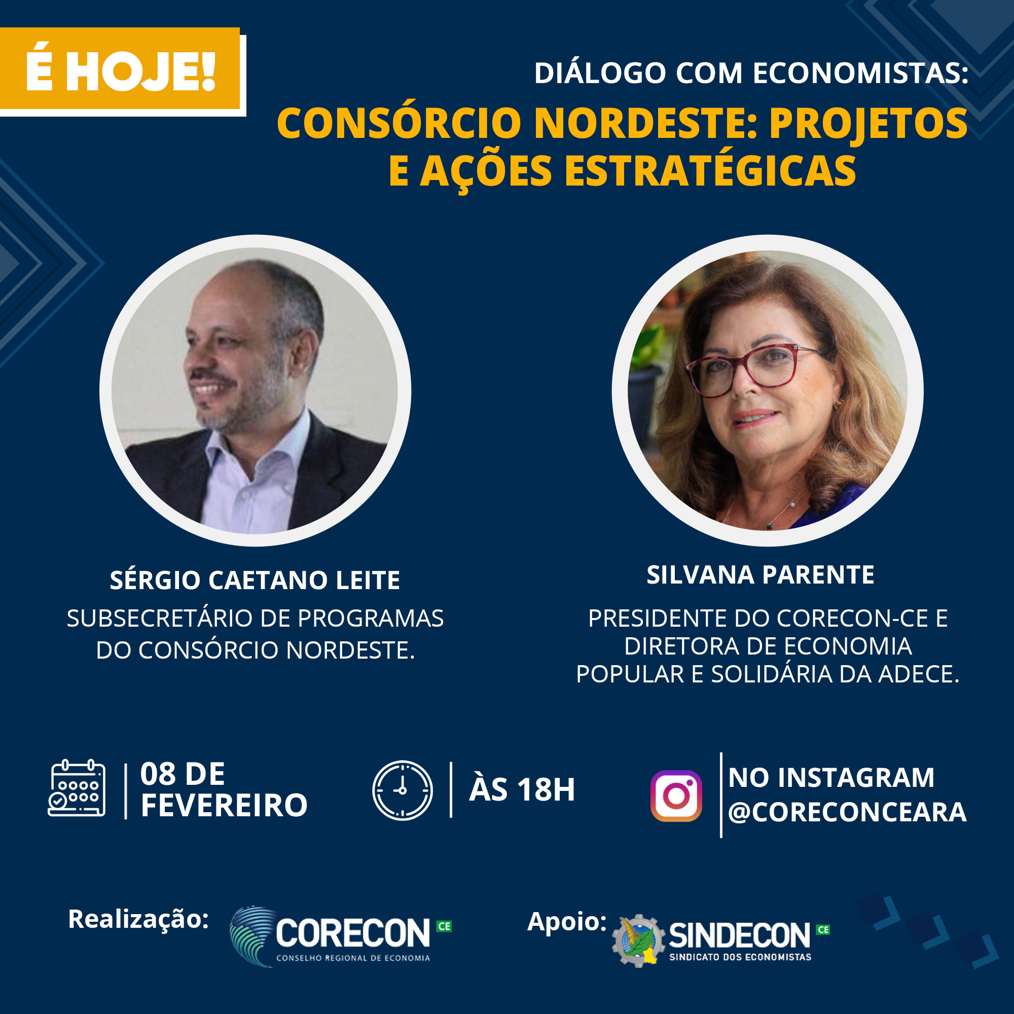 Hoje (08/02) ocorrerá a live semanal do Corecon-Ce com a temática “Consórcio Nordeste: Projetos e ações estratégicas”.