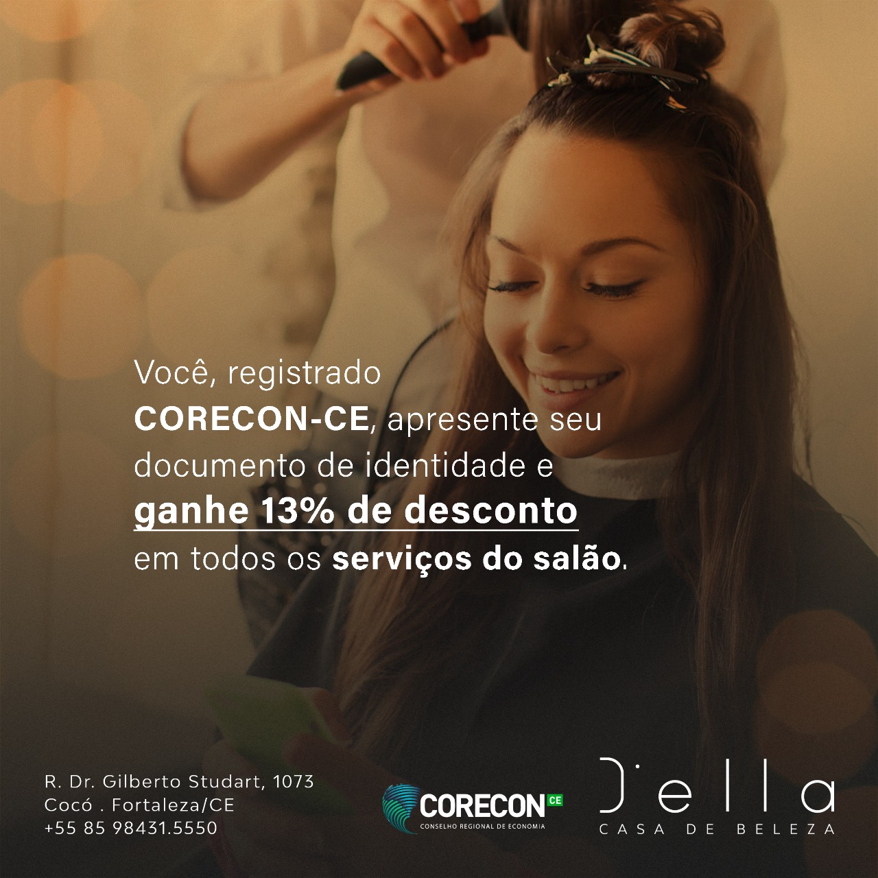 SALÃO CASA D’ELLADesconto de 13% para economistas regularmente registrados no Corecon-CeEndereço: Rua Gilberto Studart, 1073 – Cocó Telefone: (85) 9 8431-5550 | (85) 3262-3237Site: http://www.espacocasadella.com.br/ Instagram:…
